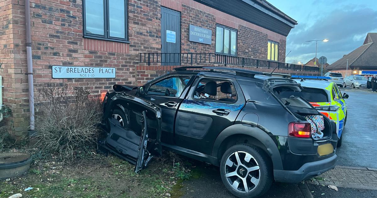 Jersey Farm Doctors Surgery was struck by the car, but photos from the scene show minimal damage to the building.